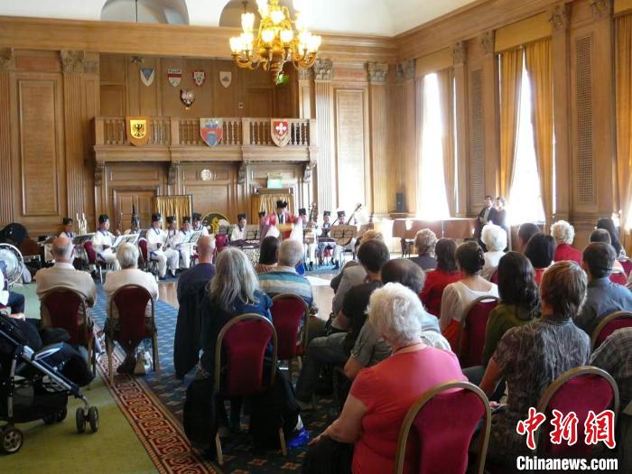 2008年9月25日,上海城隍廟道教樂(lè)團(tuán)在英國(guó)利茲市政廳演出現(xiàn)場(chǎng)?!?上海市道教協(xié)會(huì)供圖)