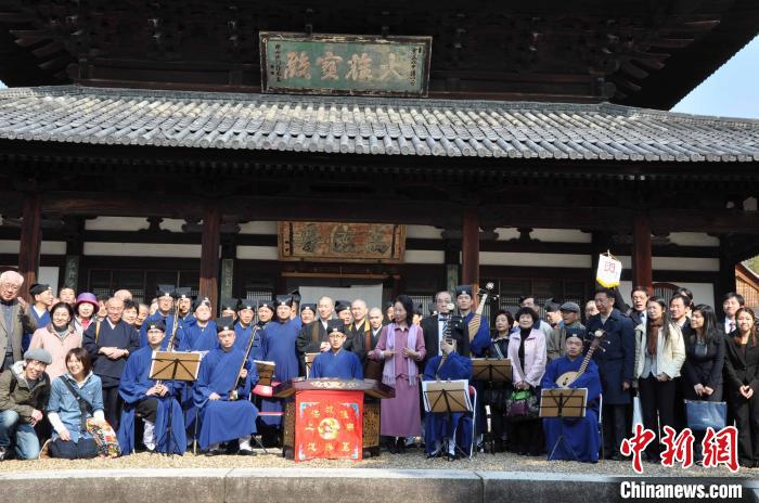 2012年4月8日,上海城隍廟道樂(lè)團(tuán)與日本觀眾在萬(wàn)福寺大雄寶殿前合影。 (上海市道教協(xié)會(huì)供圖)