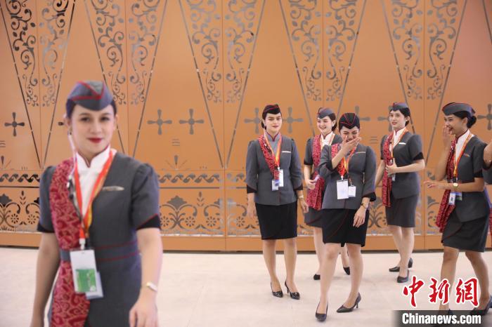 圖為乘務人員在雅萬高鐵列車模型前合影。李志全攝