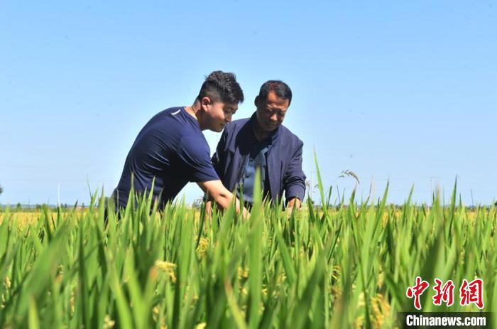 金秋時(shí)節(jié),臺(tái)胞林駿睿(左)與吉林農(nóng)民楊萬(wàn)芳在稻田里觀察水稻。 高龍安 攝