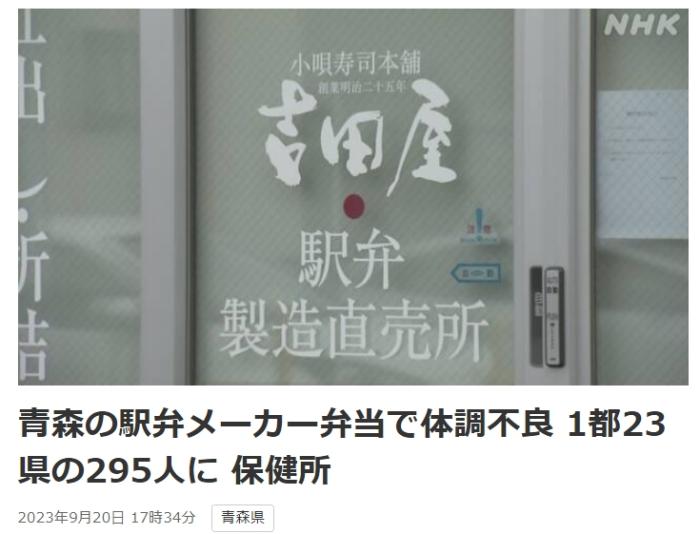中新網(wǎng)9月20日電 綜合日媒報(bào)道,20日,日本青森縣八戶(hù)市保健所發(fā)布消息稱(chēng),由當(dāng)?shù)乇惝?dāng)公司“吉田屋”引發(fā)的大規(guī)模食物中毒事件,已有295人出現(xiàn)癥狀,涉及范圍增至1都23縣。