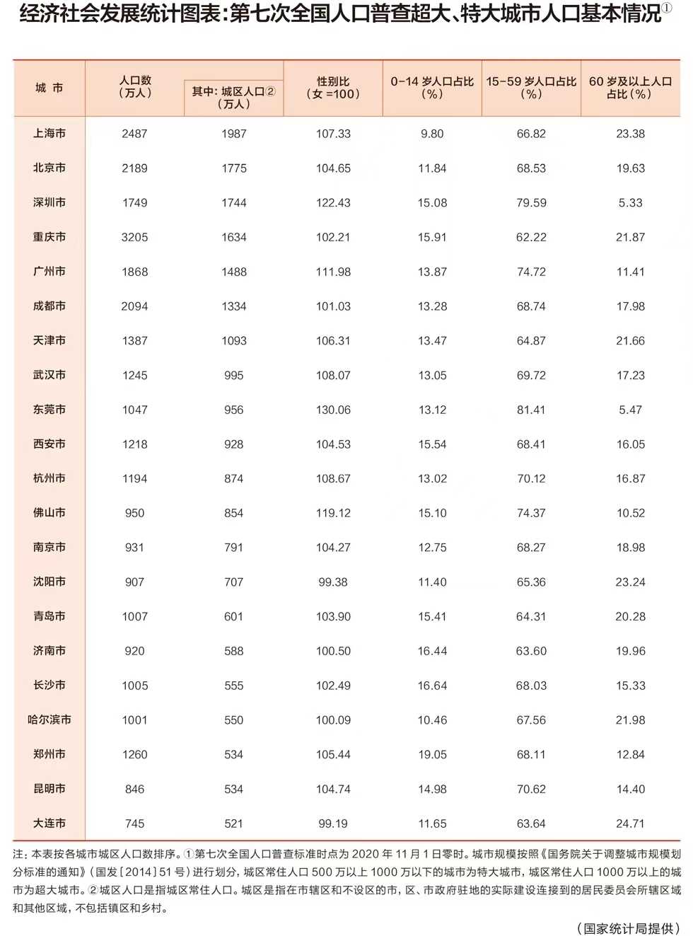 2021年9月,國(guó)家統(tǒng)計(jì)局根據(jù)2020年全國(guó)人口普查數(shù)據(jù),通過(guò)《求是》雜志發(fā)布了全國(guó)超大和特大城市名單。