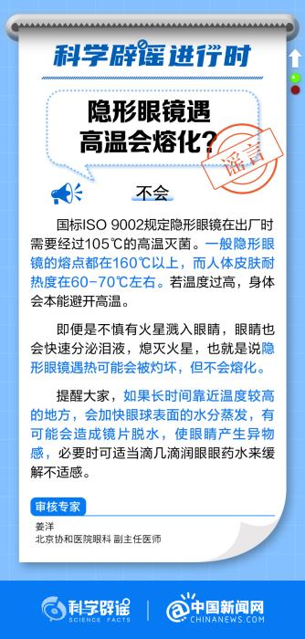 中新網(wǎng)9月20日電 吃火鍋時(shí)戴隱形眼鏡會(huì)熔化嗎?一般隱形眼鏡的熔點(diǎn)都在160℃以上,而人體皮膚耐熱度在60-70℃左右。若溫度過高,身體會(huì)本能避開高溫。即便是不慎有火星濺入眼睛,眼睛也會(huì)快速分泌淚液,熄滅火星,也就是說隱形眼鏡遇熱可能會(huì)被灼壞,但不會(huì)熔化。(來源:@科學(xué)辟謠 @中國新聞網(wǎng) )
