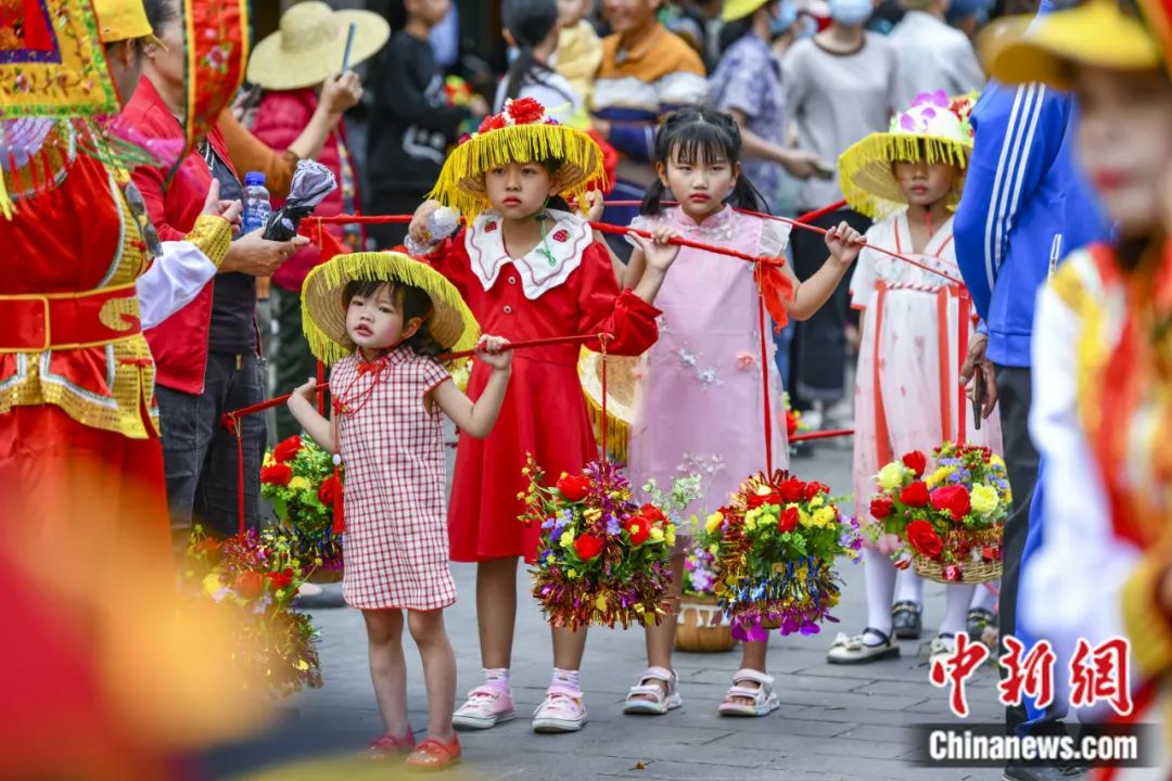 2023年2月28日,第二十二屆??谫蛉宋幕?jié)(原稱軍坡節(jié))之“裝軍巡游”活動在海南??谛缕骆?zhèn)舉行。圖為在活動中肩挑花籃的小女孩。駱云飛 攝