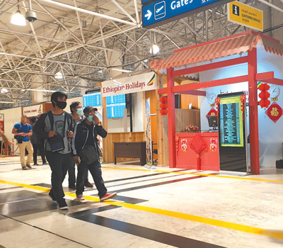 旅客經(jīng)過埃塞俄比亞博萊國際機(jī)場內(nèi)的中文服務(wù)臺(tái)。