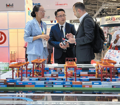 在2023年慕尼黑國際物流博覽會(huì)上,工作人員在中鐵集裝箱運(yùn)輸有限公司展臺(tái)前向國外客戶介紹廣州國際港中歐班列站點(diǎn)設(shè)施。