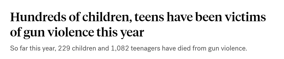 “槍支暴力檔案”的數(shù)據(jù)顯示,2023年到目前為止,美國已有229名年齡在11歲以下的兒童以及1082名青少年死于槍支暴力,受傷人數(shù)高達515名兒童和3025名青少年。