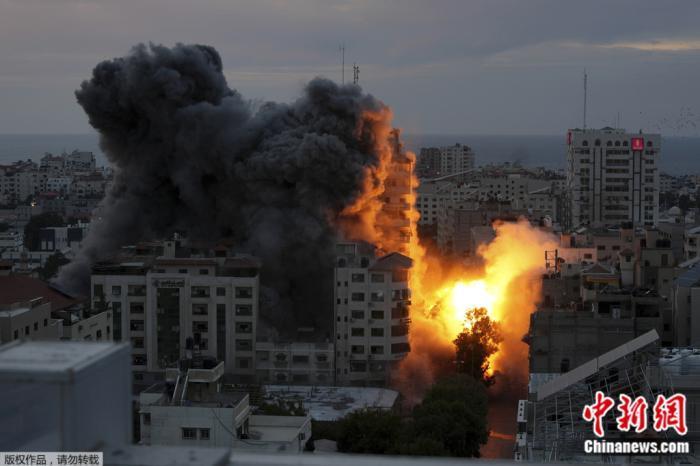 當(dāng)?shù)貢r間10月7日,以色列空襲加沙地帶,一座巴勒斯坦公寓大樓爆炸,火球和煙霧上升。