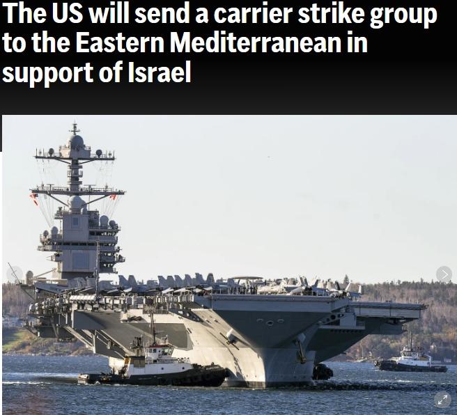 據(jù)美聯(lián)社報道,當(dāng)天,美國國防部長奧斯汀發(fā)表聲明稱,他下令“杰拉爾德·R·福特”號航空母艦戰(zhàn)斗群移至更靠近以色列的東地中海,包括一艘航空母艦、一艘導(dǎo)彈巡洋艦和四艘導(dǎo)彈驅(qū)逐艦,以展示武力,準備應(yīng)對任何情況,這些情況包括阻止更多武器送達巴勒斯坦伊斯蘭抵抗運動(哈馬斯)以及進行監(jiān)視。