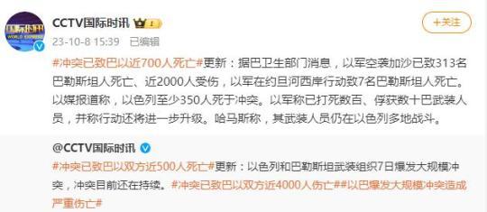 央視網消息:據CCTV國際時訊微博消息,據巴衛(wèi)生部門消息,以軍空襲加沙已致313名巴勒斯坦人死亡、近2000人受傷,以軍在約旦河西岸行動致7名巴勒斯坦人死亡。以媒報道稱,以色列至少350人死于沖突。以軍稱已打死數百、俘獲數十巴武裝人員,并稱行動還將進一步升級。哈馬斯稱,其武裝人員仍在以色列多地戰(zhàn)斗。