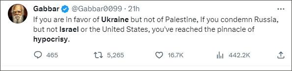 美國(guó)合眾國(guó)際社(UPI)報(bào)道注意到,有很多媒體專(zhuān)欄作者和社交媒體用戶(hù)都指出了西方在俄烏沖突等問(wèn)題上的“虛偽行為”,佩特羅并不是唯一一位。例如一名認(rèn)證為“作家”的社交媒體用戶(hù)寫(xiě)道:“如果你支持烏克蘭而不支持巴勒斯坦,如果你譴責(zé)俄羅斯卻不譴責(zé)以色列或美國(guó),那么你就已經(jīng)達(dá)到了虛偽的頂峰。”