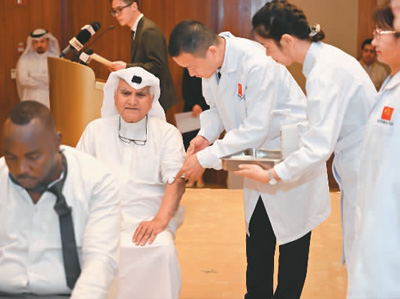 中國(吉林)第15批援科威特醫(yī)療隊在展示針灸治療。