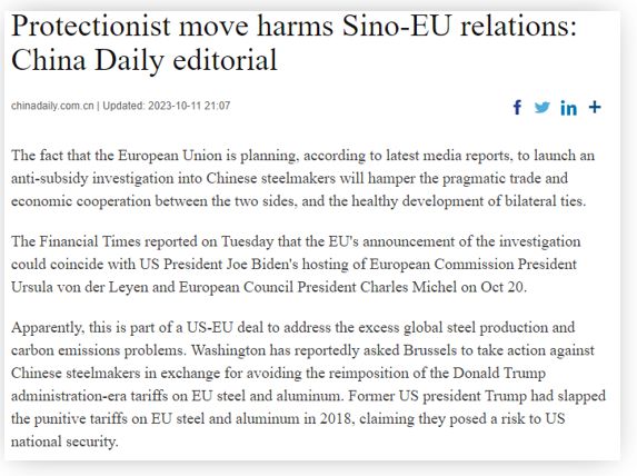 在媒體爆出計劃對中國鋼鐵企業(yè)展開反補貼調(diào)查之前,歐盟已于10月4日宣布開啟對中國電動汽車的反補貼調(diào)查,未來,歐盟或?qū)⑨槍Χ呒诱鲬土P性關(guān)稅。顯然,懲罰性關(guān)稅違背是自由市場原則的貿(mào)易保護主義措施,可能進一步擾亂全球產(chǎn)業(yè)鏈和供應鏈。