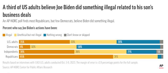 據(jù)報(bào)道,共和黨人中65%認(rèn)為拜登在與亨特·拜登的業(yè)務(wù)關(guān)系中存在非法行為,而只有8%的民主黨人這么認(rèn)為。與共和黨人相比(31%),更多的民主黨人(32%)表示他們認(rèn)為拜登的行為“不道德”,但并未 “違法”。58%的民主黨人表示,拜登 “沒有做錯任何事”。