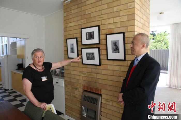 10月14日,惠特拉姆故居管理人員(左)向參訪者介紹惠特拉姆生前訪問中國(guó)的相關(guān)照片。中新社記者 顧時(shí)宏 攝