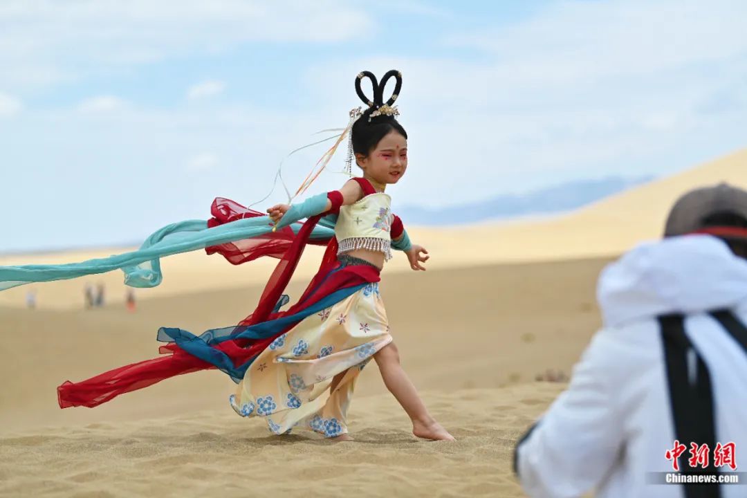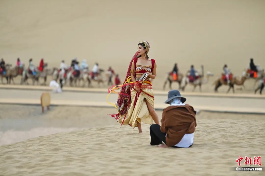 鳴沙山月牙泉景區(qū)內(nèi),游客身著西域服飾進(jìn)行旅拍。中新社記者 李亞龍 攝