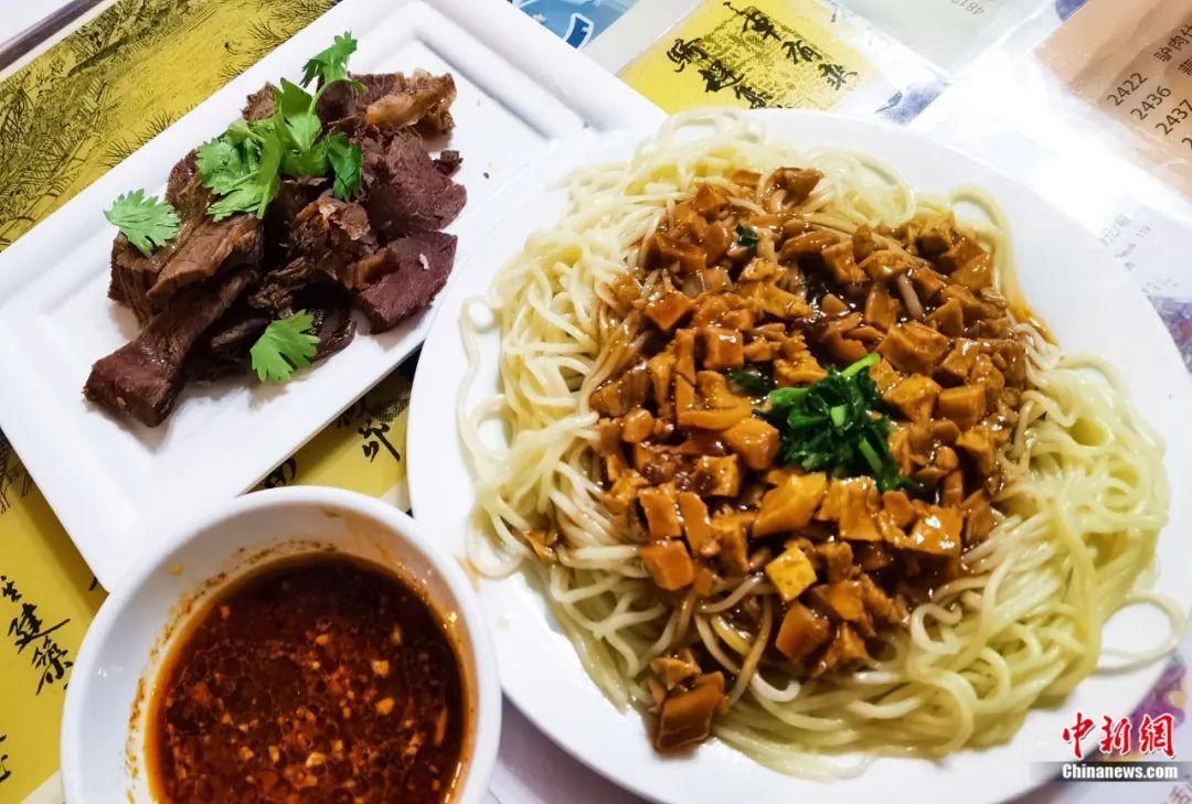 敦煌驢肉黃面。中新社記者 馮志軍 攝