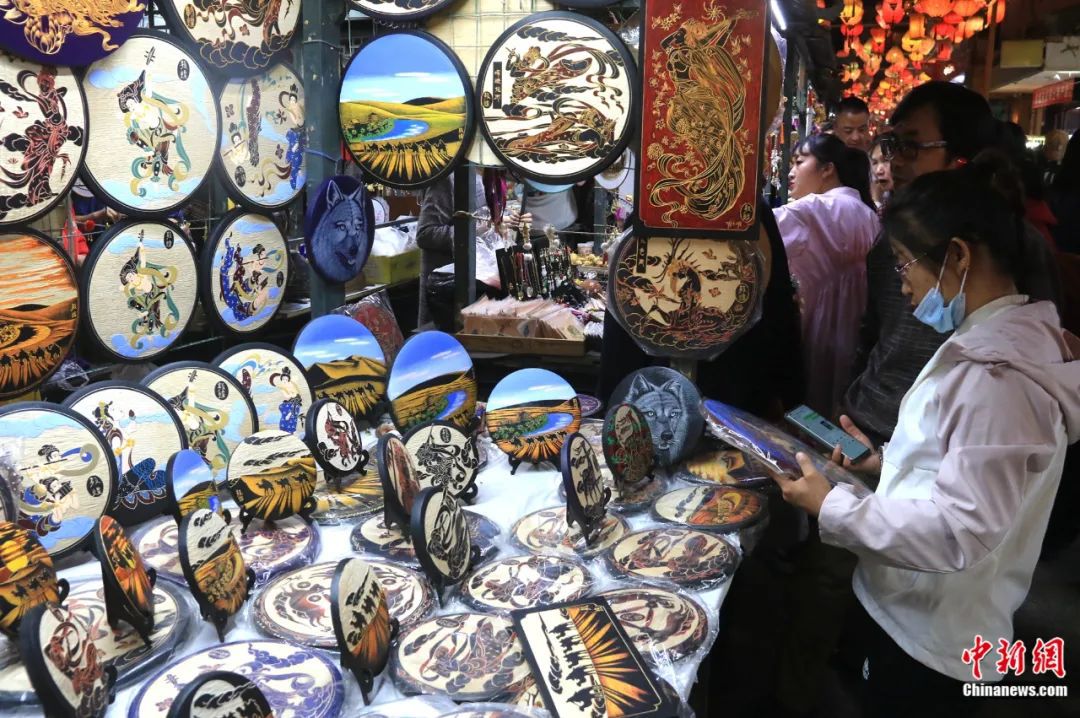 游客在敦煌夜市選購敦煌木雕畫。張曉亮 攝