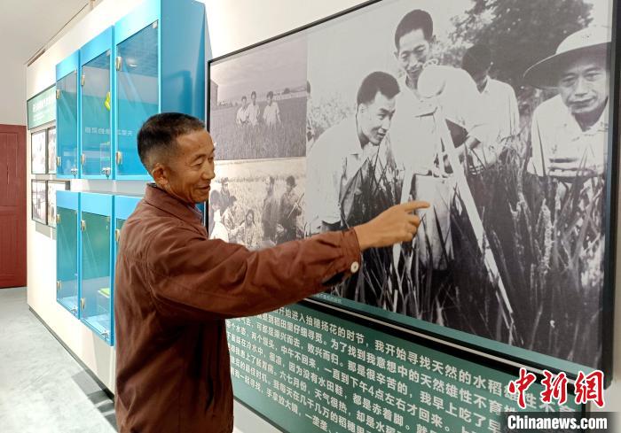 10月13日,在安江農(nóng)校紀念園內(nèi)的雜交水稻發(fā)源地紀念館,袁隆平的學生宋澤觀講述袁隆平及其團隊研究雜交水稻的故事。中新社記者 鄧霞 攝