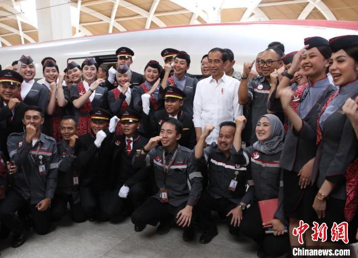 9月13日,印度尼西亞總統(tǒng)佐科考察中印尼合作項目雅萬高鐵,并在哈利姆站乘坐G5901次高鐵列車赴帕達拉朗站。這是他首次乘坐雅萬高鐵。圖為佐科在哈利姆站與乘務(wù)人員合影?!≈行律缬浾?李志全 攝