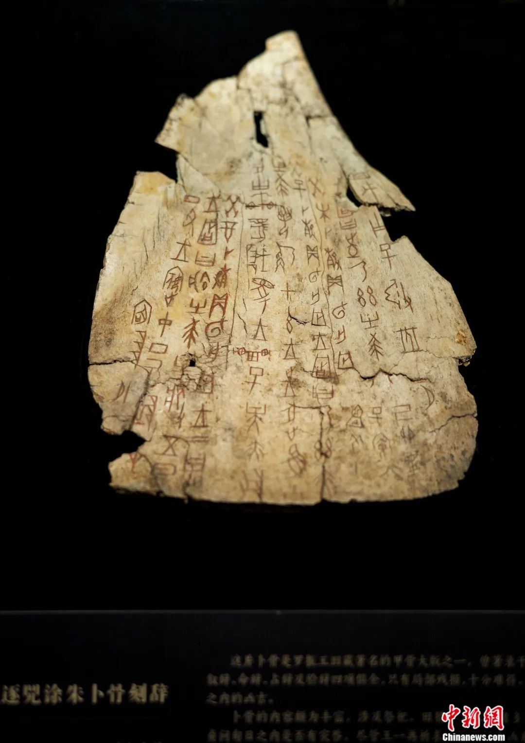 資料圖:位于北京的國家博物館內的“證古澤今——甲骨文文化展”展出的“王賓中丁·王往逐兕涂朱卜骨刻辭”卜骨。侯宇 攝