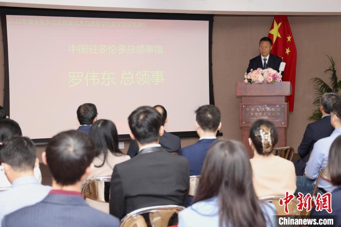 中國駐多倫多總領(lǐng)館10月21日為領(lǐng)區(qū)2022年度“國家優(yōu)秀自費(fèi)留學(xué)生獎(jiǎng)學(xué)金”獲得者頒獎(jiǎng)。圖為中國駐多倫多總領(lǐng)事羅偉東在儀式上致辭。中新社記者 余瑞冬 攝