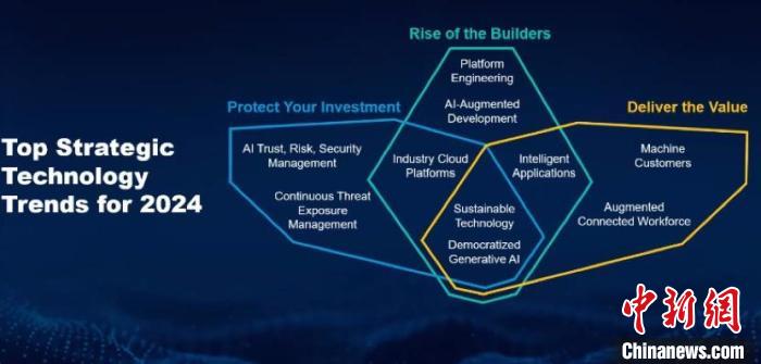 中新網(wǎng)北京10月23日電 (記者 肖欣)國(guó)際機(jī)構(gòu)高德納(Gartner)日前發(fā)布“2024年十大戰(zhàn)略技術(shù)趨勢(shì)”,此次發(fā)布的年度戰(zhàn)略技術(shù)趨勢(shì)圍繞“保護(hù)你的投資、開發(fā)者的崛起、交付價(jià)值”三大主題,人工智能(AI)成為貫穿單項(xiàng)趨勢(shì)的共同主題。