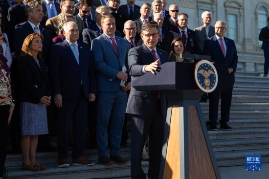 10月25日,在美國(guó)華盛頓國(guó)會(huì),新當(dāng)選的眾議院議長(zhǎng)邁克·約翰遜(后右)發(fā)表講話。新華社發(fā)(亞倫攝)