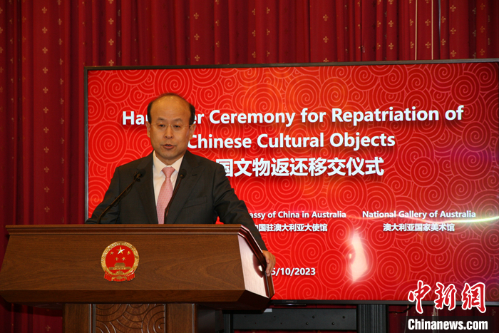 當(dāng)?shù)貢r間10月25日上午,經(jīng)中國國家文物局授權(quán),中國駐澳大利亞大使館在堪培拉舉行儀式,接收澳方向中國返還共4件流失文物藝術(shù)品與1件古生物化石。中國駐澳大利亞大使肖千在致辭中表示,這些文物回歸祖國,顯示了中澳兩國政府對于保護(hù)文化遺產(chǎn)的共同承諾,是雙方文化遺產(chǎn)交流的一次盛事和友好合作的見證。 中新社記者 顧時宏 攝