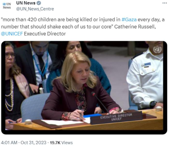 中新網(wǎng)10月31日電 據(jù)聯(lián)合國(guó)新聞消息,當(dāng)?shù)貢r(shí)間30日,聯(lián)合國(guó)兒童基金會(huì)執(zhí)行主任凱瑟琳·拉塞爾表示,最新統(tǒng)計(jì)數(shù)據(jù)顯示,目前加沙地帶每天至少有420名兒童死亡和受傷。