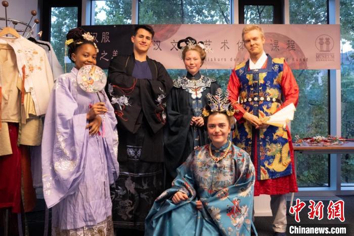 圖為德國學生身著漢服參與漢文化體驗課程,學習漢服文化。漢文化藝術(shù)交流中心供圖