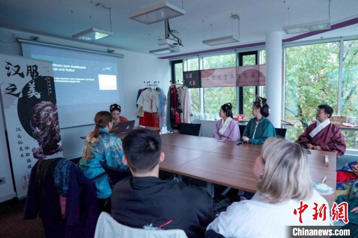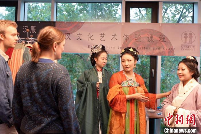 圖為活動講師為德國學生介紹漢制漢服特點。漢文化藝術(shù)交流中心供圖。