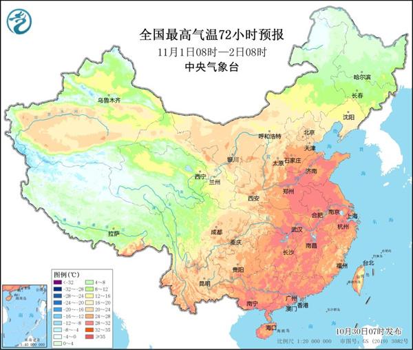 本周前期,中東部升溫還將繼續(xù)。 預(yù)計(jì)本周初,全國(guó)大部仍會(huì)以升溫為主,并且大幅偏離常態(tài)。特別是華北、黃淮一帶,11月初暖熱程度還會(huì)升級(jí),部分地區(qū)最高氣溫甚至?xí)^(guò)30℃部分,比如,鄭州,菏澤等地可能在11月1日前后迎來(lái)當(dāng)?shù)?1月觀(guān)測(cè)史上的首個(gè)30℃。