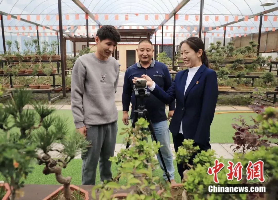 午后,在“中國盆景淘寶第一村”新河鎮(zhèn)周圈村,花農(nóng)姜愛花忙著給一株刺柏“盛裝打扮”,晚上,這株刺柏會(huì)被送往該村的“花木集市”,數(shù)十名主播將對(duì)其直播競(jìng)拍。