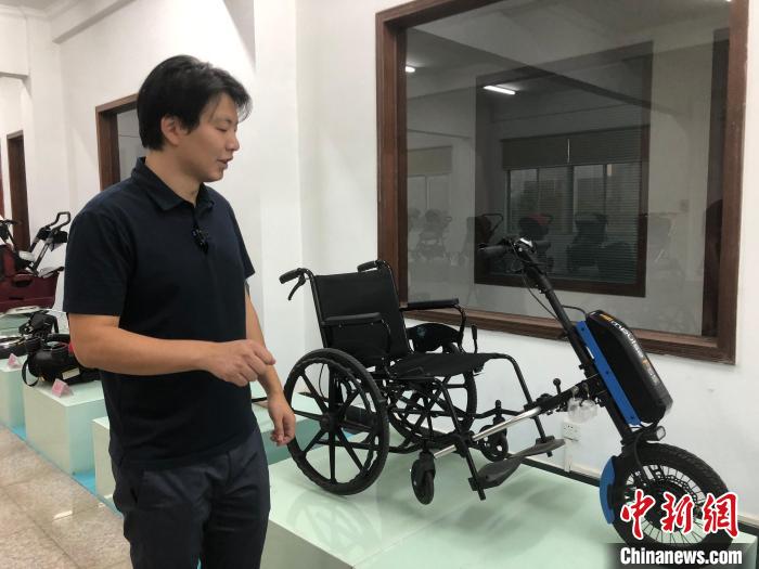 10月17日,臺灣青年楊博弘向記者介紹公司新產品電動輪椅車頭。中新社記者 孫秋霞 攝