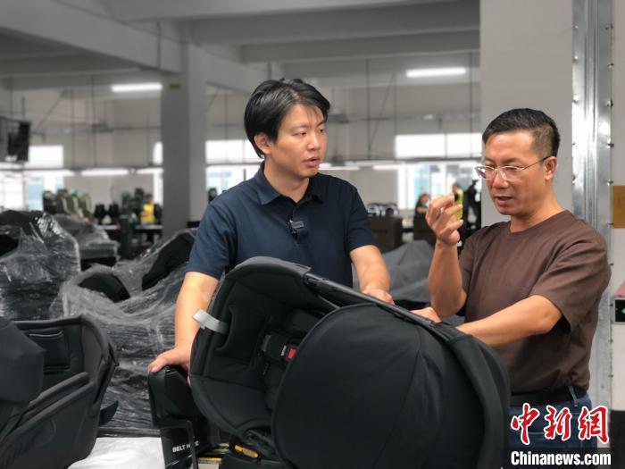 10月17日,臺灣青年楊博弘(左一)在惠州工廠詢問嬰童安全座椅生產情況。中新社記者 孫秋霞 攝