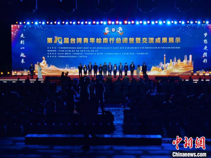 在第十屆臺(tái)灣青年嶺南行總閉營(yíng)儀式上,臺(tái)灣社團(tuán)和港澳社團(tuán)青年代表登臺(tái)送上對(duì)嶺南行活動(dòng)十周年的美好祝福。郭軍 攝