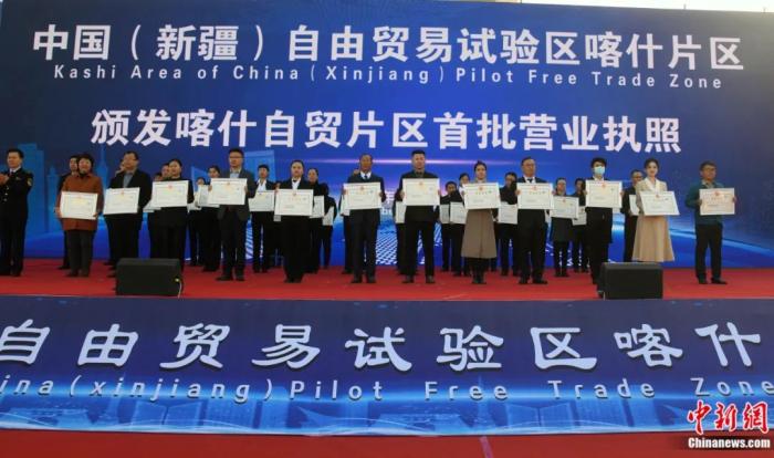2023年11月11日,中國(guó)(新疆)自由貿(mào)易試驗(yàn)區(qū)喀什片區(qū)揭牌。圖為首批入駐自貿(mào)片區(qū)的經(jīng)營(yíng)主體獲頒營(yíng)業(yè)執(zhí)照。孫亭文 攝