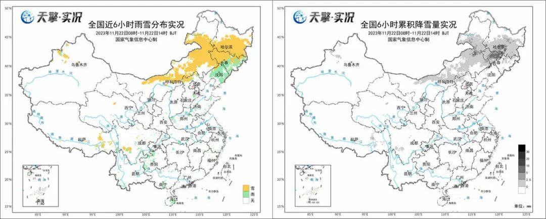實(shí)況數(shù)據(jù)顯示,今天白天,內(nèi)蒙古中東部以及東北地區(qū)大部都出現(xiàn)了雨雪天氣,其中,內(nèi)蒙古中東部、黑龍江中南部一帶以降雪為主,吉林、遼寧等地以降雨為主;黑龍江最強(qiáng)降雪集中在哈爾濱,尚志6小時(shí)降雪量超10毫米,達(dá)到暴雪以上量級(jí)。