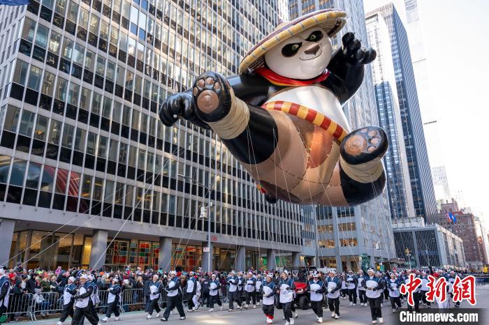 當(dāng)?shù)貢r(shí)間11月23日,第97屆梅西百貨感恩節(jié)大游行在美國紐約曼哈頓舉行。圖為基于動畫電影《功夫熊貓》里阿寶的造型設(shè)計(jì)的巨型氣球行進(jìn)在曼哈頓街頭?!≈行律缬浾?王帆 攝
