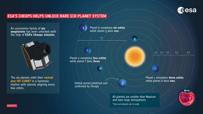美國國家航空航天局(NASA)的“凌日系外行星巡天衛(wèi)星”(TESS)在2020年和2022年觀測(cè) HD110067,發(fā)現(xiàn)該恒星亮度的數(shù)次下降,加之來自“系外行星特性探測(cè)衛(wèi)星”(CHEOPS)的更多觀測(cè),論文第一作者和通訊作者、美國芝加哥大學(xué)R. Luque與同事及合作者研究認(rèn)為,這些跡象可解釋為6顆行星從恒星前面經(jīng)過。通過研究3顆最深處行星,他們計(jì)算了所有6顆行星的軌道,從最深處的約9天,到最外層的約54天。