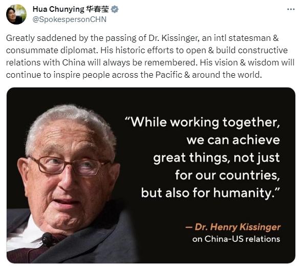 華春瑩寫(xiě)道,“我對(duì)基辛格博士的逝世深感悲痛,他是一位國(guó)際政治家和杰出的外交家。我們將永遠(yuǎn)銘記他為開(kāi)拓和建立同中國(guó)的建設(shè)性關(guān)系所作的歷史性努力。他的遠(yuǎn)見(jiàn)和智慧將繼續(xù)激勵(lì)太平洋地區(qū)乃至世界各地的人們?!?/p>