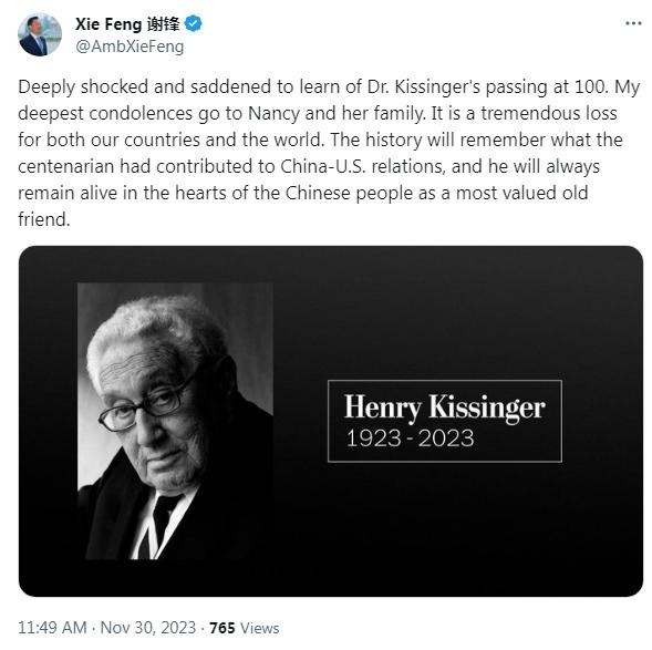 謝鋒寫道,“得知基辛格博士去世,享年100歲,我深感震驚和悲痛。我向南希(基辛格夫人)以及她的家人致以最深切的哀悼。這對我們(中美)兩國和世界來說都是巨大的損失。歷史將銘記這位百歲老人為中美關(guān)系作出的貢獻(xiàn),他將作為最珍貴的老朋友,永遠(yuǎn)活在中國人民心中。”