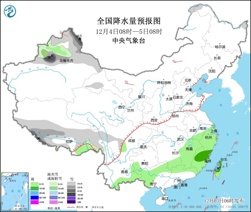 12月4日08時至5日08時,新疆北部、西藏西南部和東部等地部分地區(qū)有小到中雪或雨夾雪,其中,新疆北疆東部和沿天山地區(qū)、西藏西南部等地部分地區(qū)有大到暴雪,局地大暴雪(20~25毫米)。江南大部、云南東部和南部、華南北部和西部、臺灣島等地部分地區(qū)有小到中雨,其中,臺灣島中北部等地部分地區(qū)有大雨(25~40毫米)。內(nèi)蒙古中西部、遼東半島、新疆北部等地部分地區(qū)有4~6級風。