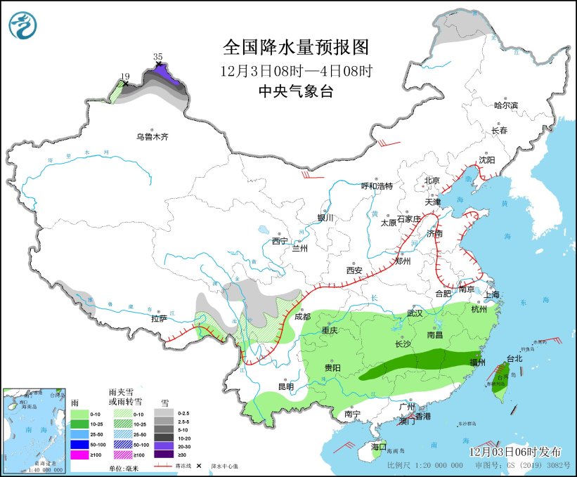 12月3日08時至4日08時,新疆北部、內(nèi)蒙古東北部、黑龍江西北部、西藏西南部和東部、川西高原等地部分地區(qū)有小到中雪或雨夾雪,其中,新疆北疆北部等地部分地區(qū)有大到暴雪,局地大暴雪或特大暴雪(30~35毫米)。江南、西南地區(qū)東部和南部、華南北部和西部、臺灣島等地部分地區(qū)有小雨,其中,湖南南部、江西中南部、福建中部、廣西東北部、臺灣島中北部等地部分地區(qū)有中雨。內(nèi)蒙古中西部等地部分地區(qū)有4~6級風。