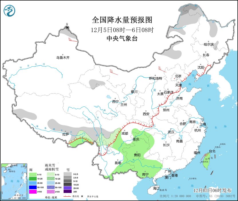 12月5日08時至6日08時,新疆北疆北部、內(nèi)蒙古中東部、黑龍江西北部、西藏東部和北部、甘肅河西、川西高原等地部分地區(qū)有小雪或雨夾雪,其中,內(nèi)蒙古東北部、黑龍江西北部、新疆北疆北部等地部分地區(qū)有中到大雪(5~8毫米)。西南地區(qū)東部、云南東部、廣西大部、臺灣島等地部分地區(qū)有小雨。新疆北部、內(nèi)蒙古中西部等地部分地區(qū)有4~6級風。