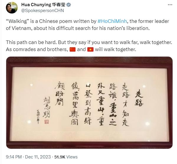 華春瑩寫道,“《走路》是越南老一輩領(lǐng)導(dǎo)人胡志明所寫的一首漢語詩,講述了他爭取國家解放的艱難歷程。這條路可能很艱難。但人們說,如果想走得遠,就要一起走。作為同志和兄弟,中國和越南將一路同行?!?/p>