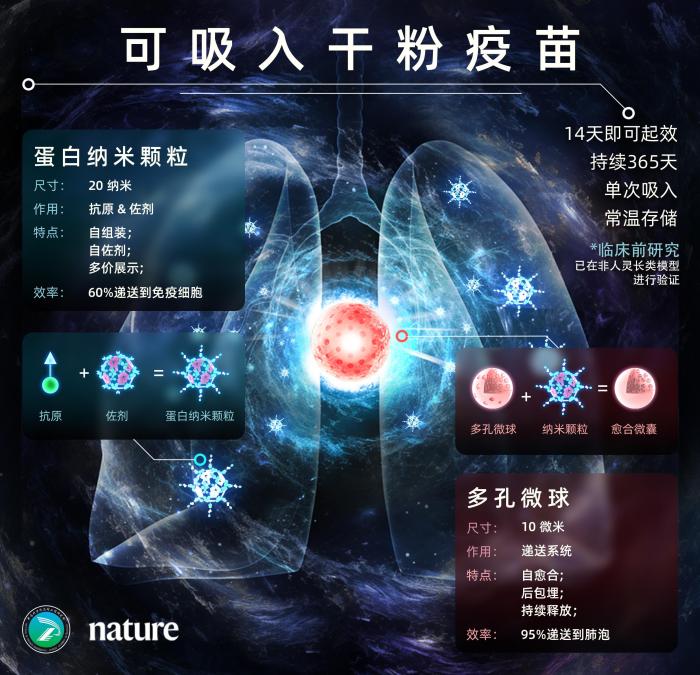 目前,這項研究已在實驗室成功制備出新型干粉吸入式疫苗,并且在動物模型上顯示出能夠高效阻斷呼吸道病毒的感染與傳播。北京時間12月14日凌晨,相關(guān)成果論文在國際著名學(xué)術(shù)期刊《自然》(Nature)上線發(fā)表。