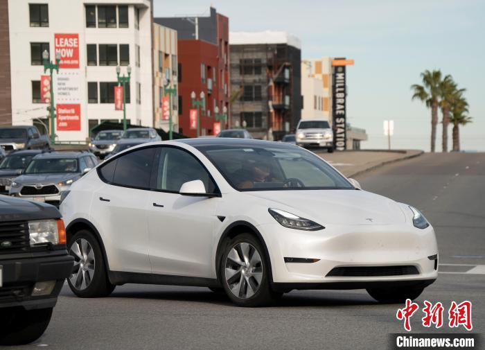 當(dāng)?shù)貢r(shí)間12月13日,特斯拉電動(dòng)汽車駛過美國(guó)加州圣馬特奧縣一處路口?!≈行律缬浾?劉關(guān)關(guān) 攝
