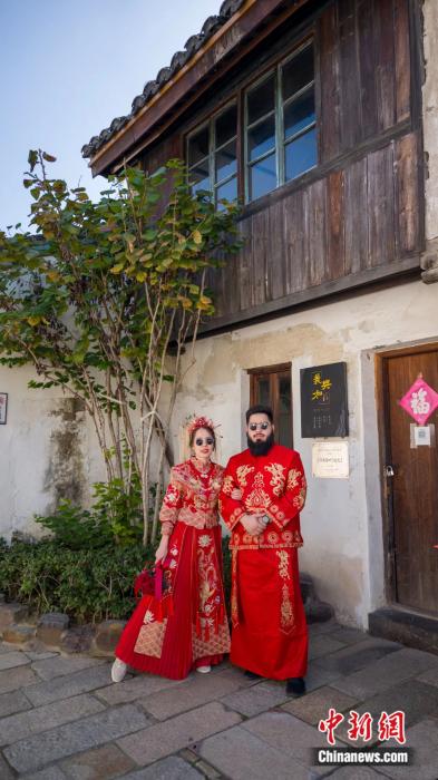 就在不久前,美莎和沙吶沙拍了中式婚紗照,身著紅色秀禾服的美莎選擇與先生在白墻灰瓦的中式園林建筑中留下二人愛(ài)情的見(jiàn)證。而兩人的婚禮也頗有戲劇性,雙方父母在土庫(kù)曼斯坦家鄉(xiāng)為兩人辦酒,沒(méi)能回國(guó)的他們則通過(guò)視頻遠(yuǎn)程參加了自己的婚禮,接受家人們的祝福。美莎笑稱(chēng),她的微信婚禮很特別,很能代表中國(guó)速度。